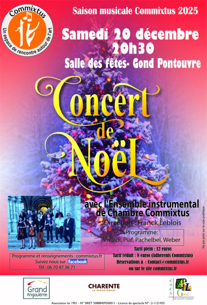CONCERT DE NOELavec l’ensemble instrumental de Chambre COMMIXTUSavec un programme diversifié de Vivaldi, Piaf, Pachebel et Weber